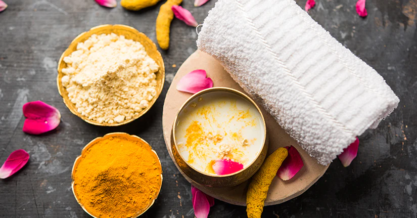 ہلدی اور چندن جیسی اجزاء جلد کی بے رنگی اور دھبوں کو کم کرتی ہیں، جلد کی رنگت یکساں کرتی ہیں اور قدرتی چمک دیتی ہیں۔