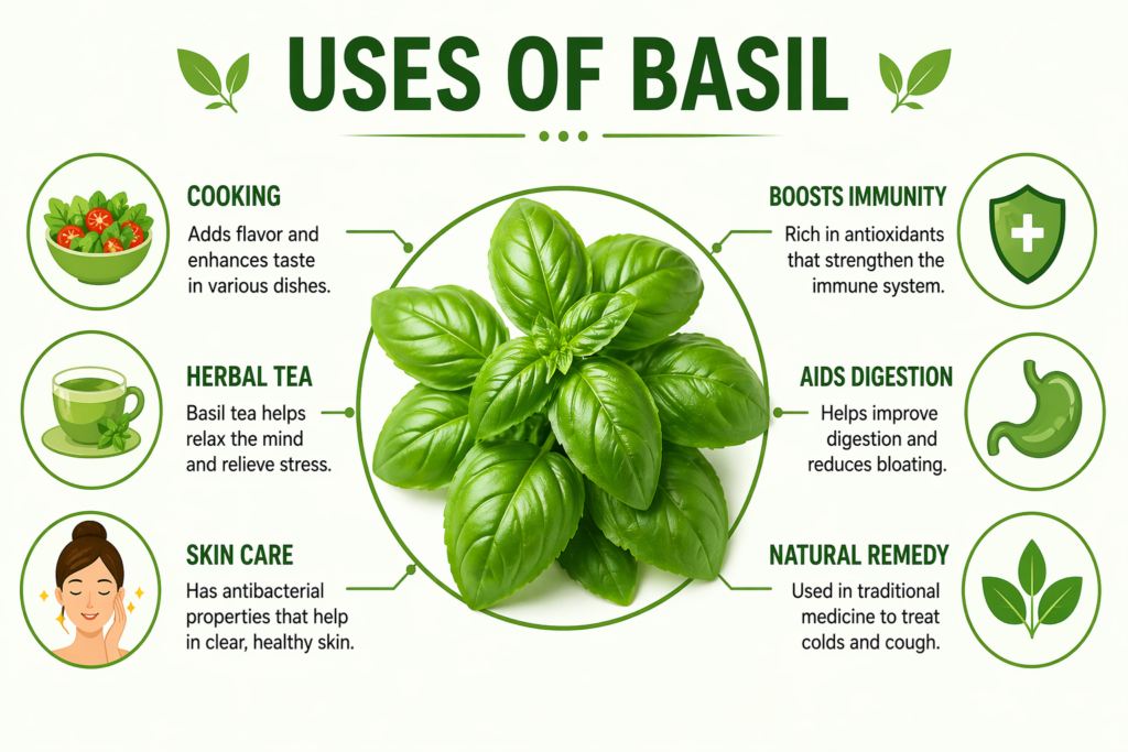 Chewing 3–5 fresh basil leaves daily, especially in the morning, helps boost immunity and supports overall health. This is one of the simplest and most effective ways to use basil.