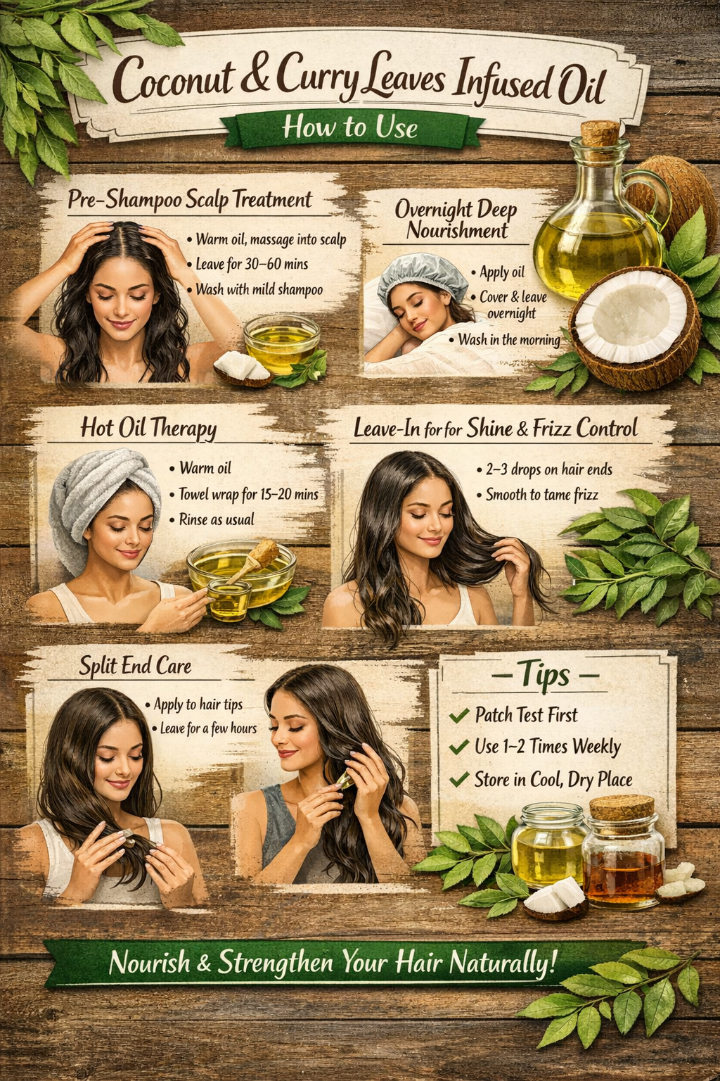 Curry leaves contain antioxidants, amino acids, and essential nutrients that help strengthen hair follicles and support natural hair growth. Regular scalp massage improves blood circulation, enhancing nutrient delivery to roots.
